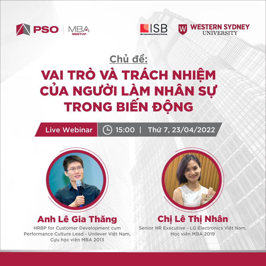 MBA Meetup số tháng 4 sẽ là buổi chia sẻ của những khách mời đến từ các tập đoàn đa quốc gia về vai trò và trách nhiệm của bộ phận Nhân sự đối với mỗi doanh nghiệp, đặc biệt là trong bối cảnh môi trường kinh doanh biến động không ngừng như hiện nay.