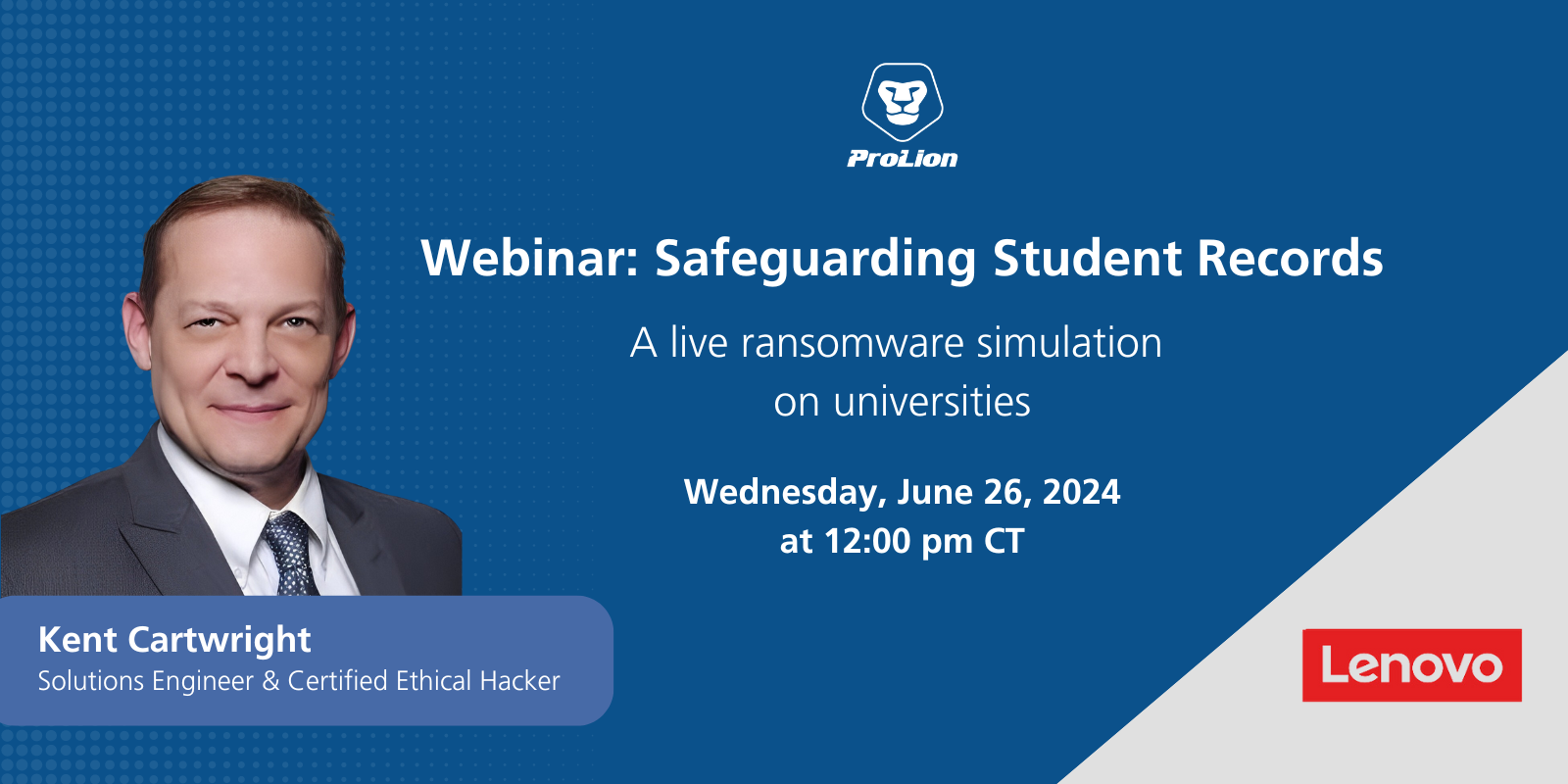 In this 45-minute webinar, Kent Cartwright, ProLion Solutions Engineer and Certified Ethical Hacker, will demonstrate a live ransomware attack in which a university's network is compromised after a student unwittingly downloads a malicious app onto their laptop.